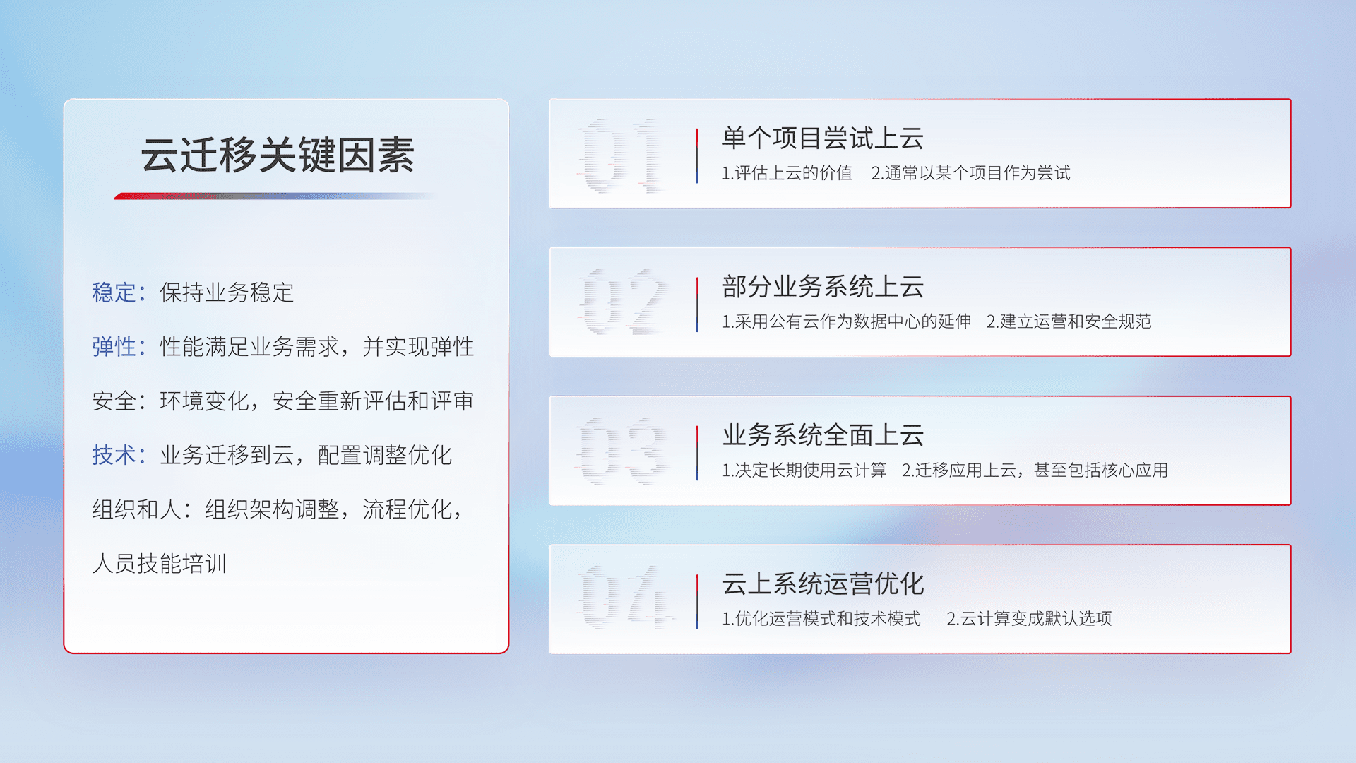 结合实际业务,,从规划设计、、云平台选型、、、、云原生改造、、、数据迁移、、集成交付,,迁移全过程为客户识别最佳上云路径,,,,做好风险识别管理,,设计网络架构、、、身份权限、、、安全审计合规、、操作审计、、日志审计、、、监控告警策略、、、多站点容灾设计等,,,对云上基础设施进行整体规划,,,,提升IT治理水平,,,,以满足弹性、、、高可用、、、高性能的需求。。