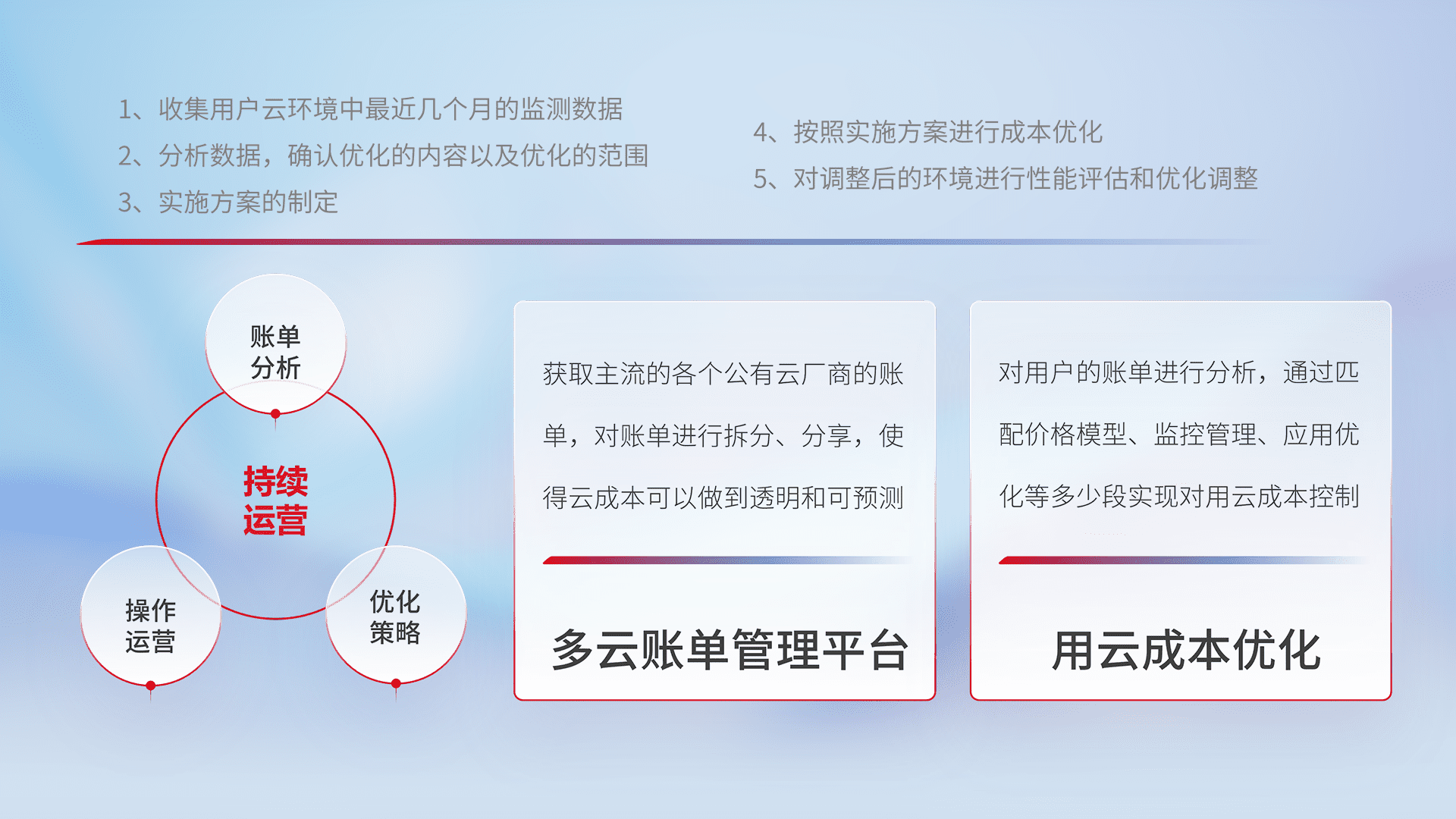 通过多云纳管,,,以统一的资源数据模型把客户的云资源进行抽象和封装,,,进而实现对多云资源的统一操作,,,保障云资源管理的可靠性、、、、稳定性与可用性。。量身定制化运维内容,,配置、、、开发运维、、补丁管理、、、备份、、、监控、、、认证和访问管理、、审计和日常巡检等,,保障在用云过程中的可靠度,,稳定度以及高可用率。。。